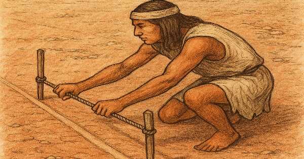 - 描き方は、木の杭とロープを使った単純な方法が有力。